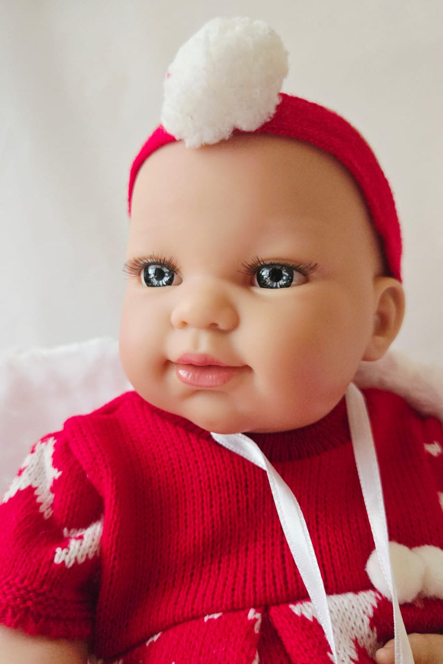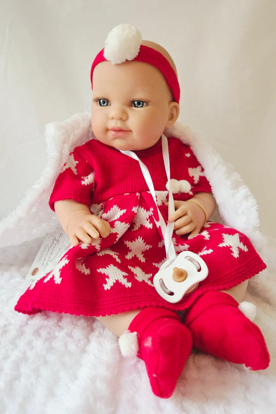 Les accessoires fournis avec Nina : plaid blanc, culotte blanche, robe de noël, chaussons rouges, bandeau rouge, tétine.